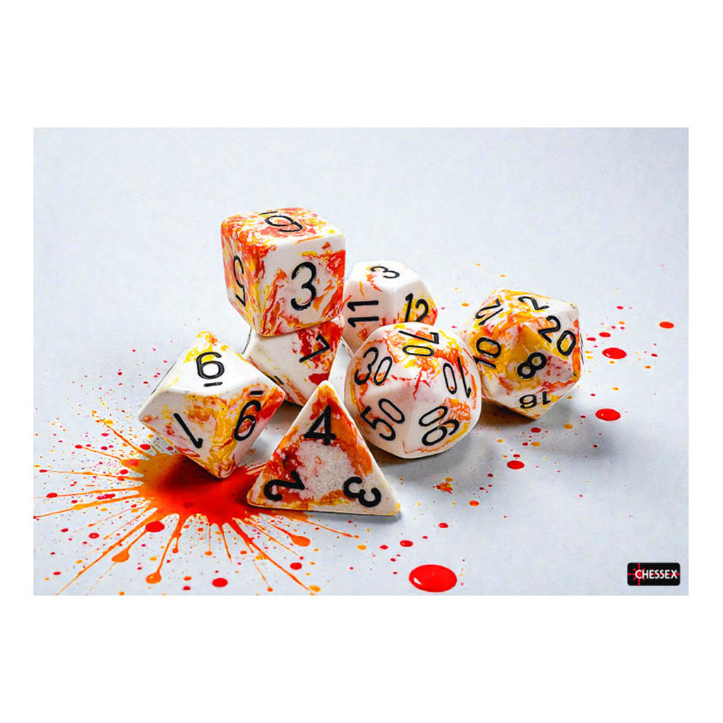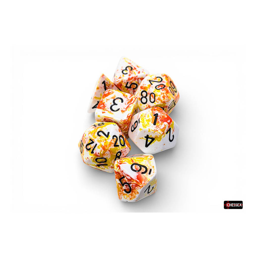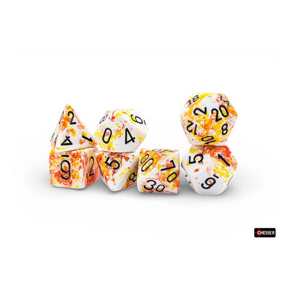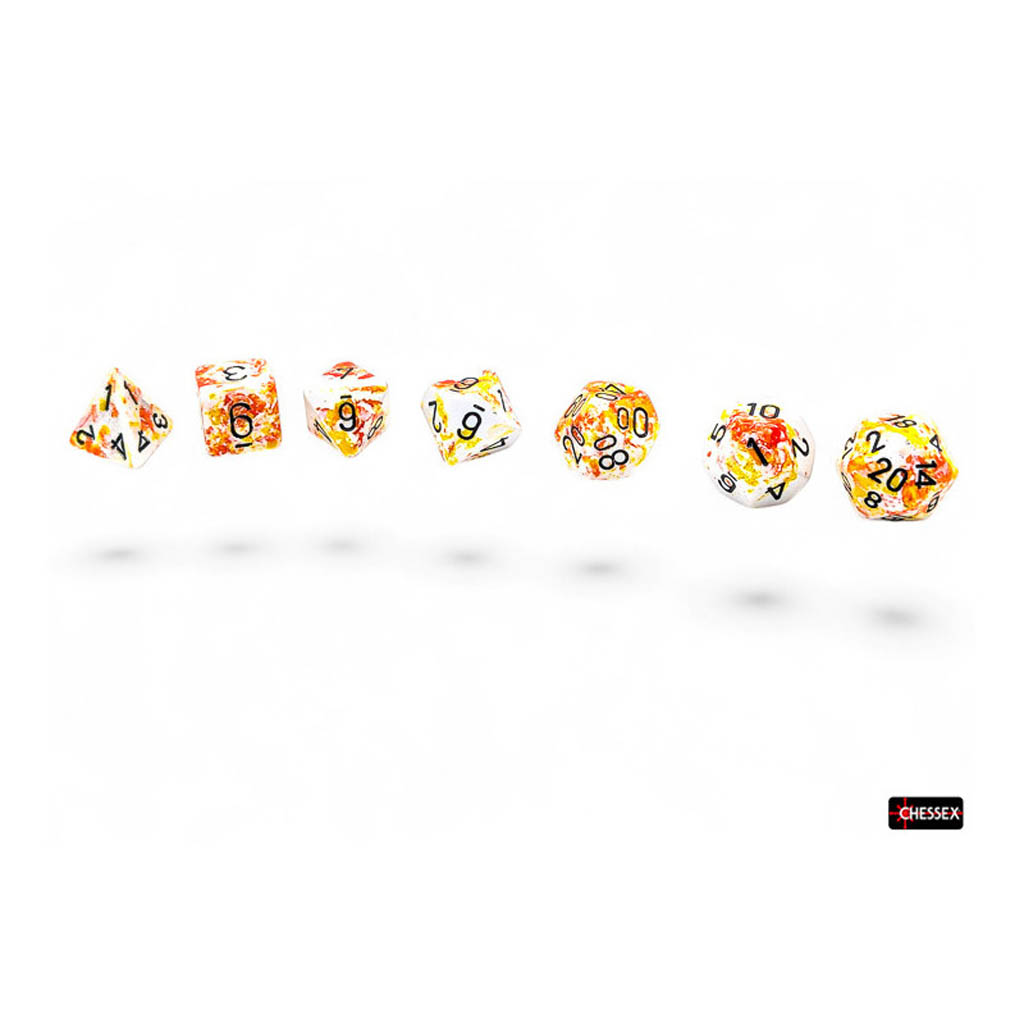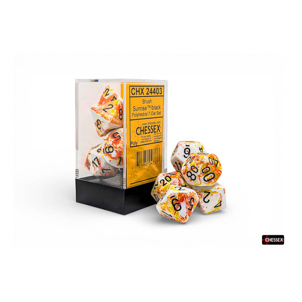 Ce coffret contient 7 dés Brush™ Sunrise™ à chiffres noirs, de formes suivantes :