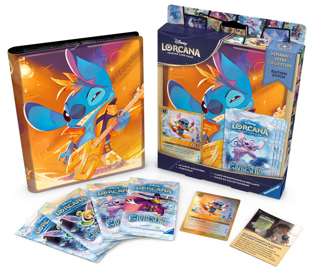 Lorcana – Coffret Démarrez Votre Collection – Givresort est un coffret de démarrage pour Lorcana comprenant 4 boosters du set Givresort, un guide du collectionneur, un portfolio A5 pour ranger vos cartes et une carte promo brillante Stitch.