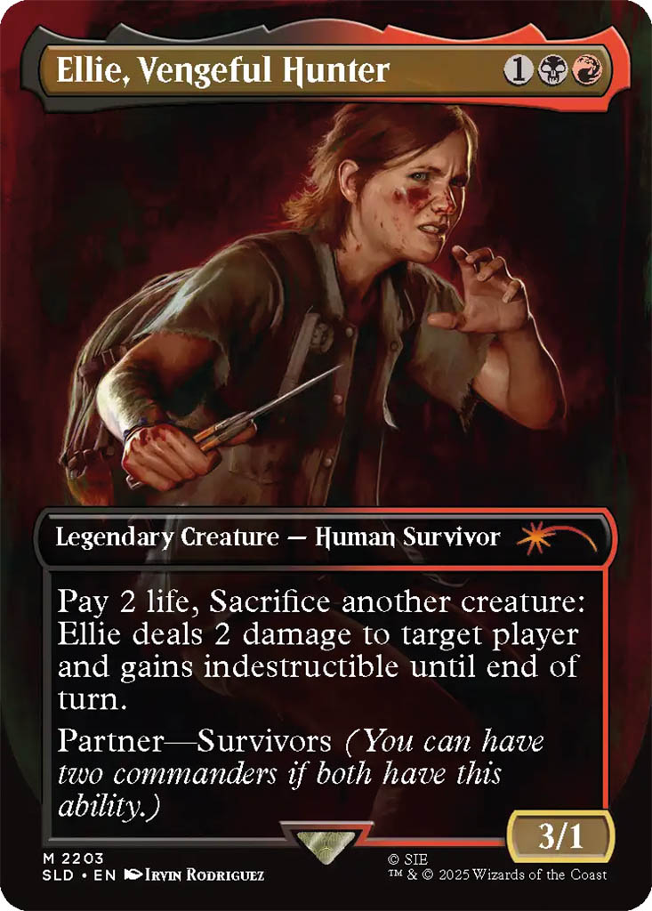 REMARQUE : La mécanique de partenariat « Survivors » permet aux cartes de Joel et d’Ellie de Secret Lair x The Last of Us Part I d’être utilisées avec les cartes d’Abby et d’Ellie de Secret Lair x The Last of Us Part II. Cela signifie que techniquement, Ellie peut être en partenariat avec la version plus jeune d’elle-même (et Abby avec Joel si votre cruauté est sans limite).