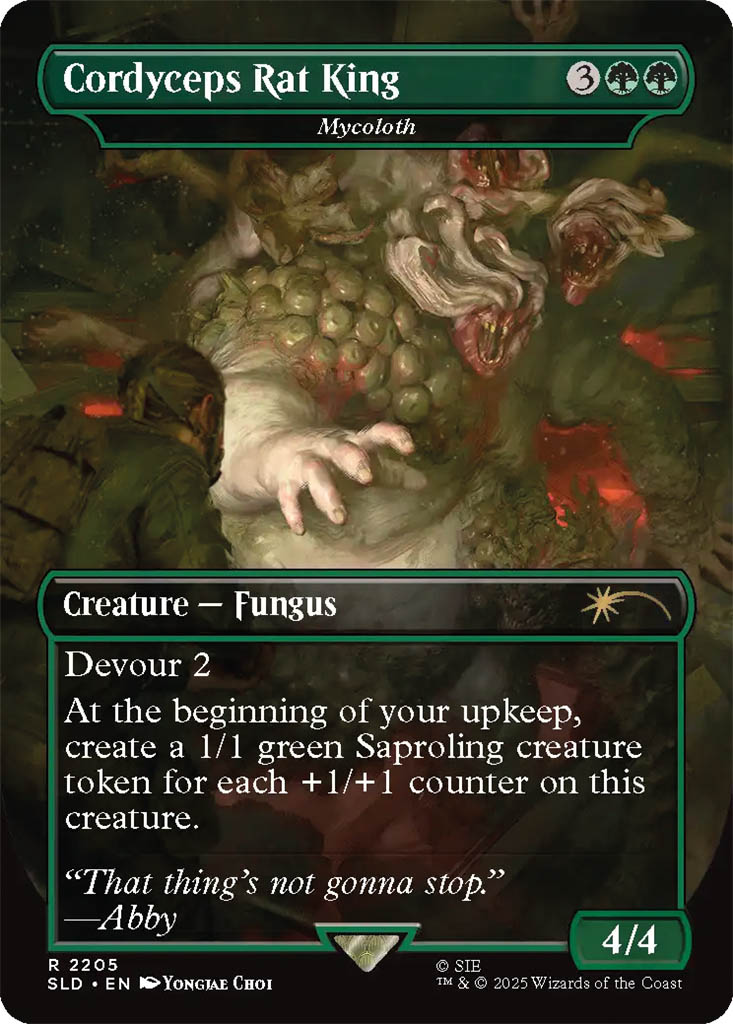 La suite très attendue de The Last of Us a replongé les joueurs dans un monde à jamais changé par l’infection du Cordyceps aux côtés de personnages marquants, quatre ans plus tard. Ce drop Secret Lair contient deux survivantes liées par le sang versé, avec de nouvelles cartes pour Ellie et Abby qui explorent les concepts de vengeance et de perspective. Pour les accompagner, vous ne manquerez pas de chair à sacrifice avec Mycoloth en tant que « Cordyceps Rat King » , pour mieux en faire payer le prix à votre adversaire avec Dictate of Erebos en tant que « Ellie’s Rage » . (Avec, bien entendu, l’immanquable jeton Cordyceps Infected pour servir de cible aux briques perdues.)