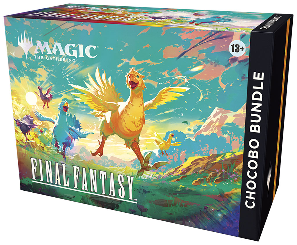 CONTENU DU BUNDLE CHOCOBO : 10 boosters de 14 cartes, un booster Chocobo de 12 cartes, une carte promo Premium traditionnelle à illustration alternative, une carte scénique sur 24, 32 terrains de base (16 en Premium traditionnel, 16 en standard), un compteur à molette exclusif et une boîte de rangement Chocobo