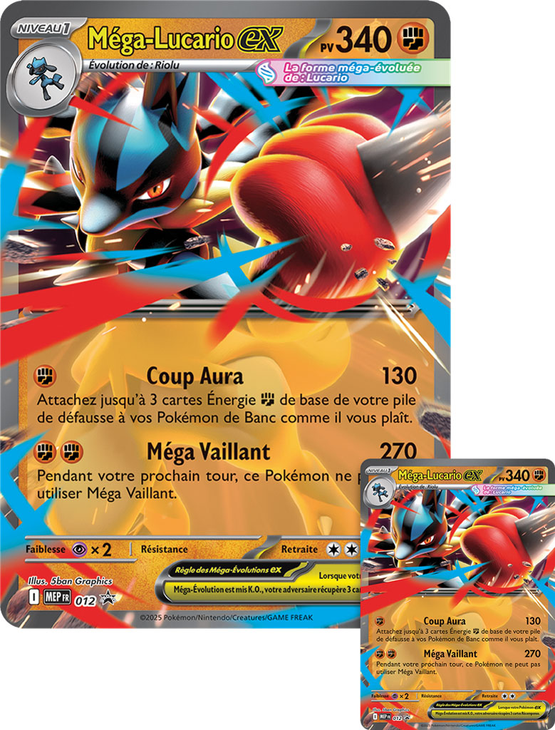 1 carte promo texturée brillante de Méga-Lucario-ex , 1 carte promo grand format de Méga-Lucario-ex , 1 figurine de Méga-Lucario , 5 boosters du JCC Pokémon, 1 carte à code pour le JCC Pokémon Live