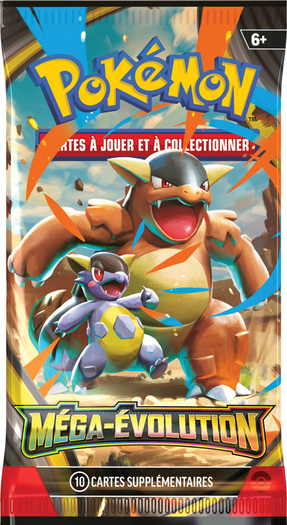 Chaque booster de l’extension Méga-Évolution du JCC Pokémon contient 10 cartes, 1 énergie de base ou 1 carte à code pour le JCC Pokémon Live.