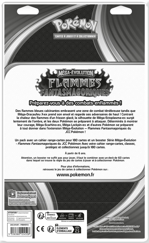 Des flammes bleues calcinantes embrasent une zone de combat ténébreuse tandis que Méga-Dracaufeu X-ex prend son envol et regarde ses adversaires de haut ! Contrant la chaleur des flammes d’un frisson glacé, la silhouette de Méga-Ectoplasma-ex surgit lentement de l’ombre, et les deux Pokémon se préparent à attaquer. Déterminés à montrer leur courage, Méga-Scarhino-ex, Méga-Lockpin-ex et d’autres Pokémon se préparent à tout donner dans l’extension Méga-Évolution – Flammes Fantasmagoriques du JCC Pokémon !