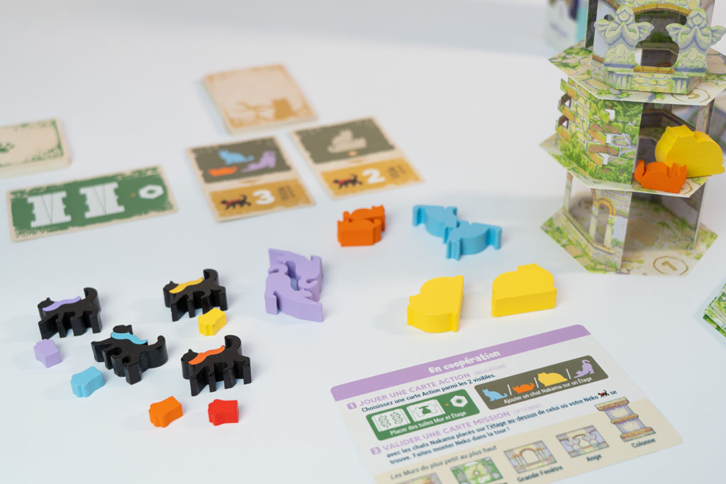 Les joueurs construisent ensemble la tour avec des tuiles Mur et Étage. Des cartes Mission demandent de placer certains chats colorés sur l’étage au-dessus de celui où se trouve Neko (ex. : deux chats de couleurs différentes doivent se toucher). À chaque mission réussie, Neko monte d’un ou plusieurs étages selon la mission accomplie.