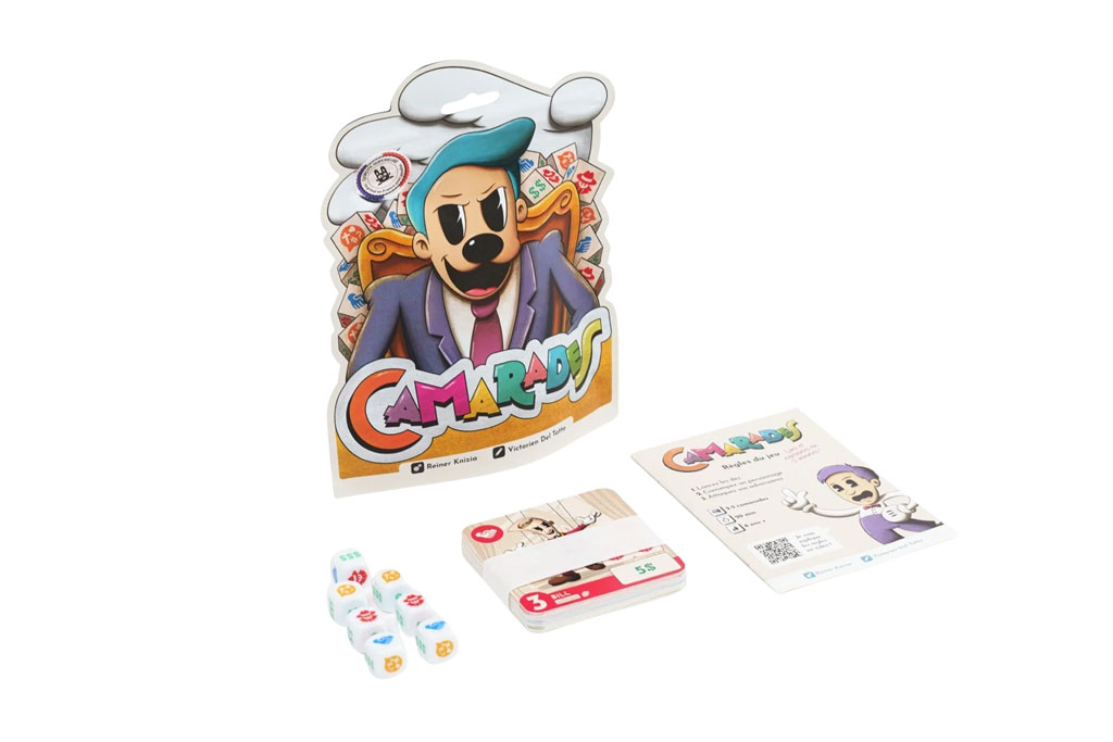 “Camarades” est la réédition d’un classique du Dr Reiner Knizia : Risk Express (aussi connu sous le nom de Age of War). Il est possible d’ajouter du piment à vos parties avec l’extension “La bombe”, fournie avec la piste de dés unique et inédite, spéciale Camarades.