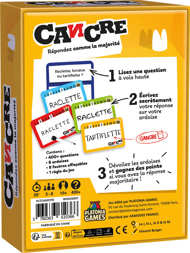 CANCRE est un jeu d’ambiance pour 3 à 8 joueurs autour d’un concept simple : répondre comme la majorité. À chaque tour, un joueur lit une question à voix haute (ex. : « Raclette, fondue ou tartiflette ? » ). Les autres écrivent leur réponse secrètement sur leur ardoise. Ensuite, tout le monde révèle sa réponse.