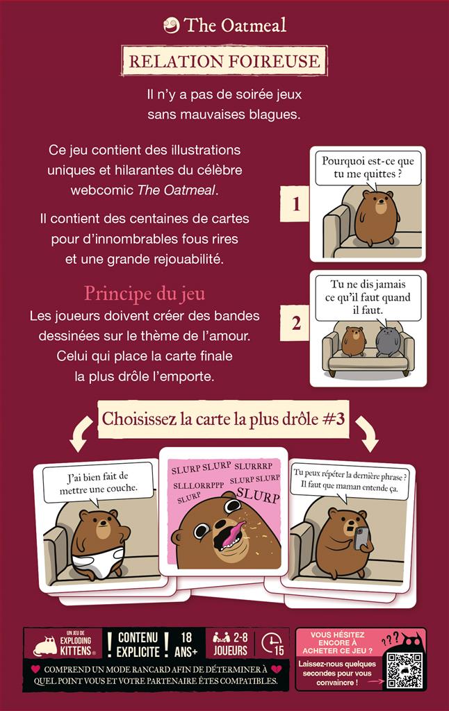 Relation Foireuse est un jeu d’ambiance pour adultes, aussi irrévérencieux qu’hilarant. À chaque manche, vous composez de mini bandes dessinées à partir de cartes illustrées sur le thème de l’amour. Le but ? Créer l’histoire avec la chute la plus drôle. Et chacun sait que les histoires d’amour finissent mal, en général ! Les joueurs vont devoir convaincre le juge de la manche que leur chute est la plus appropriée. Situations absurdes, dialogues douteux et rebondissements trash… Chaque carte, signée The Oatmeal, déborde d’un humour visuel sans filtre.
