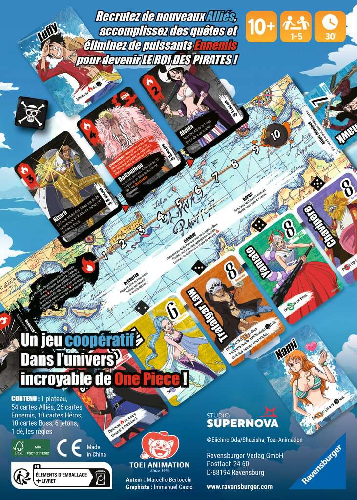 Un jeu de société manga accessible dès 10 ans qui rassemble fans et familles autour de l’esprit nakama. Votre aventure commence maintenant !Plongez au c◊ur de l’univers One Piece avec ce jeu de société coopératif ! Incarnez Monkey D. Luffy et son équipage légendaire dans une aventure tactique où l’esprit nakama prime sur tout. Recrutez plus de 100 personnages iconiques issus de toute la saga : Zoro, Nami, Sanji, mais aussi vos alliés préférés de chaque arc narratif. Affrontez les ennemis les plus redoutables comme Doflamingo ou Crocodile grâce à une mécanique de coopération maligne basée sur la communication limitée. Accomplissez des quêtes, gérez astucieusement vos cartes et coordonnez-vous pour vaincre avant que le niveau de menace ne devienne incontrôlable. Ce jeu One Piece de 1 à 5 joueurs dès 10 ans séduit autant les connaisseurs du manga que les novices. Parties de 30 minutes intenses, rejouabilité infinie avec le système de Boss modulable. L’aventure ultime vous attend sur Grand Line !