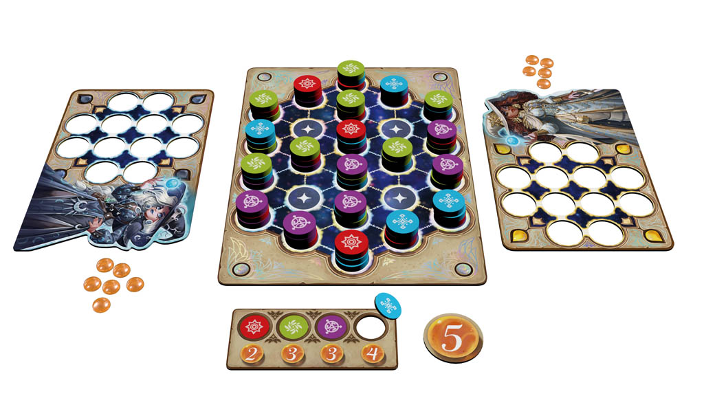 Pour y parvenir, les joueurs vont déplacer des piles de jetons sur le plateau central en utilisant leur énergie pour former des triangles de même couleur. Alors, ils pourront récupérer un jeton pour le placer astucieusement sur leur plateau Magicienne.