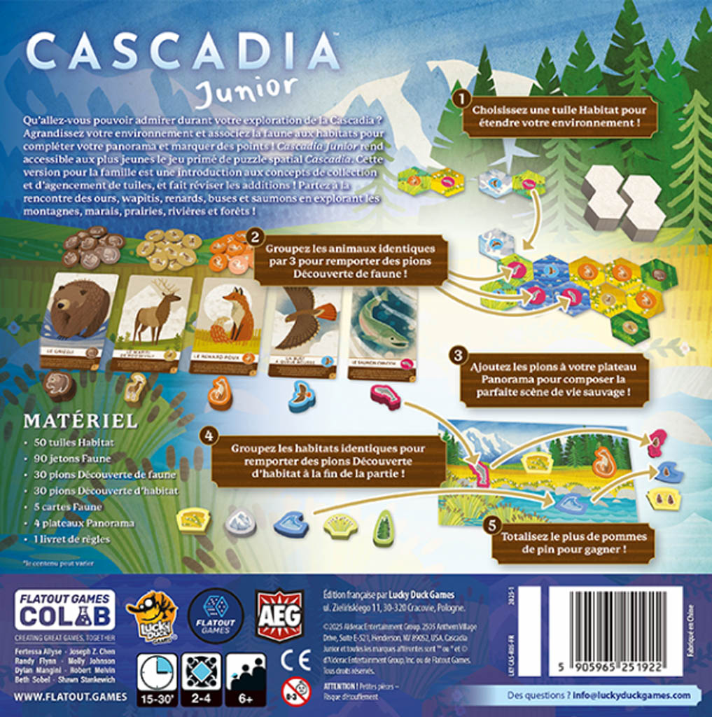 Elle permet aux plus jeunes de s’initier au placement de tuiles, aux objectifs spatialisés et au comptage de points : Construisez votre environnement en y ajoutant de nouvelles tuiles. Récupérez des jetons sur votre diorama en faisant correspondre animaux et paysages. La version avancée incluse imposant des formes à chaque animal, permet de passer aisément à la version familiale de Cascadia.