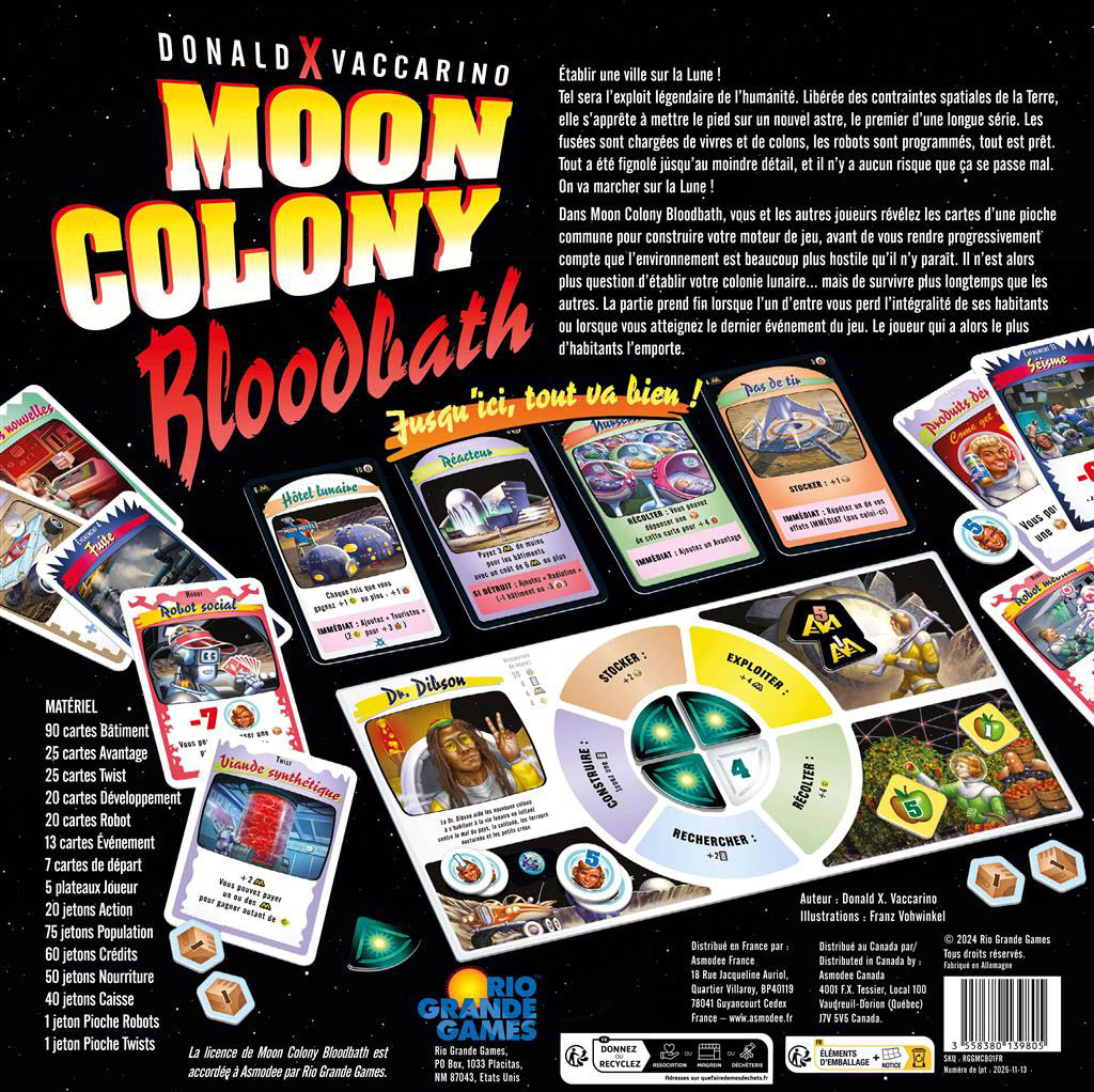 Moon Colony Bloodbath est un jeu de cartes surprenant où les joueurs sont chargés de fonder une colonie sur la Lune. Mais les choses ne se passent pas comme prévu et le vainqueur de la partie sera celui qui a su préserver un maximum d’habitants de sa colonie en prenant les bonnes décisions face aux événements.