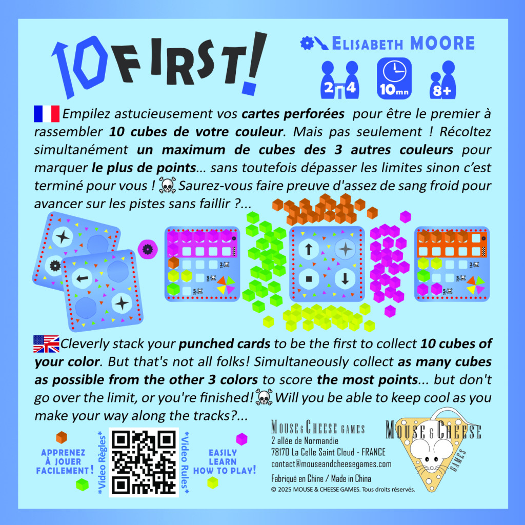 Empilez astucieusement vos cartes perforées pour être le premier à rassembler 10 cubes de votre couleur. Mais pas seulement ! Récoltez simultanément un maximum de cubes des 3 autres couleurs pour marquer le plus de points… sans toutefois dépasser les limites sinon c’est terminé pour vous ! Saurez-vous faire preuve d’assez de sang froid pour avancer sur les pistes sans faillir ?…