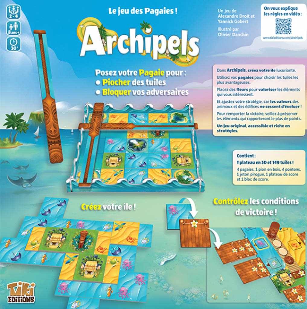 Dans Archipels, créez votre île luxuriante. Utilisez vos pagaies pour choisir les tuiles les plus avantageuses. Placez des fleurs pour valoriser les éléments qui vous intéressent. Et ajustez votre stratégie, car les valeurs des animaux et des édifices ne cessent d’évoluer ! Pour remporter la victoire, veillez à préserver les éléments qui rapporteront le plus de points. Un jeu original, accessible et riche en stratégies.