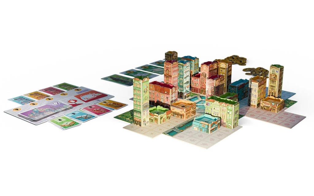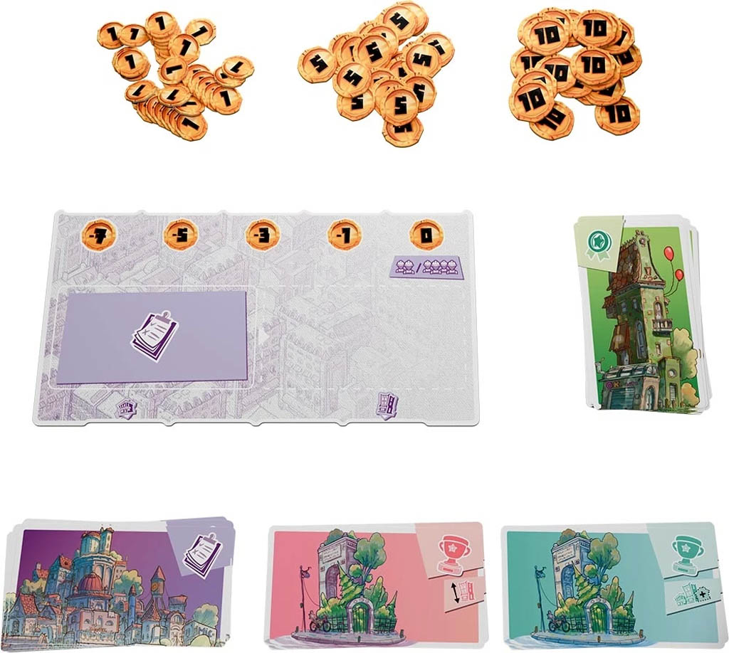 Pour l’emporter, choisissez avec soin l’emplacement où ériger vos bâtiments afin de remplir les contrats les plus avantageux, tout en respectant les contraintes imposées par la mairie. La concurrence est rude : choisissez stratégiquement votre place dans l’ordre de construction et soyez prêt à payer le prix fort pour les meilleurs emplacements. Une fois vos huit bâtiments construits, la partie prend fin. Si vous êtes le plus riche, vous remportez la partie !