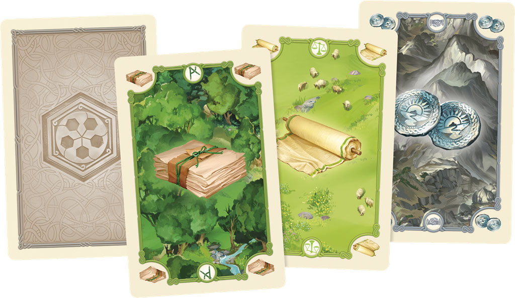 2 plateaux amélioration de ville, 18 cartes Article de Commerce, 2 cartes Référence, 2 jetons Point de Victoire, 2 fiches Coûts de Construction, 6 marqueurs Ville, 12 figurines violettes, 12 figurines vertes, 12 heaumes, 2 pions « Château », 2 boites de rangement et 1 livret de règles