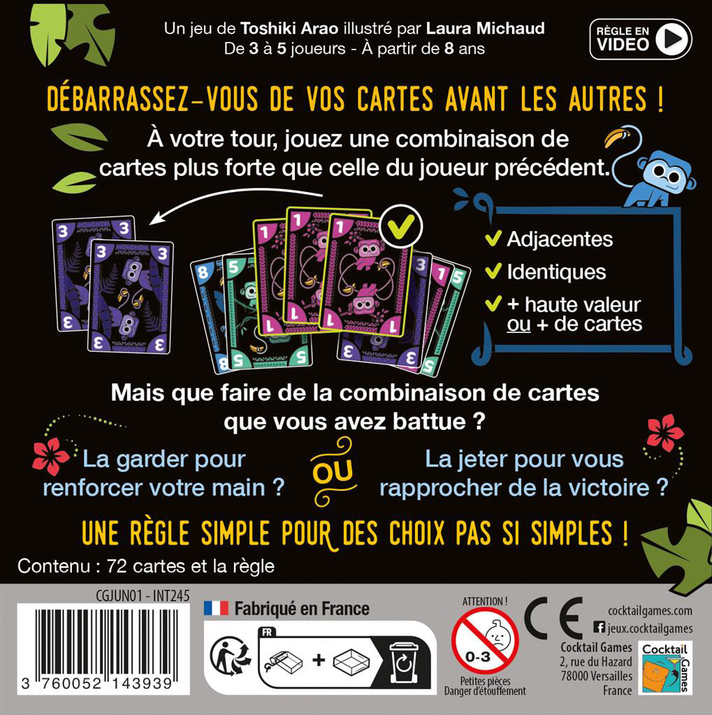 Jungo est un jeu de construction de main où le but est d’être le premier à se débarrasser de toutes ses cartes. À chaque tour, vous devez battre la combinaison sur la table en jouant des cartes adjacentes de même valeur de votre main… sans jamais les trier ! Plus vous jouez de cartes, plus la combinaison est forte. Si vous ne pouvez pas jouer, vous piochez une carte et décidez de la garder ou de l’exposer à tous. Le premier joueur à se défausser de toutes ses cartes remporte la partie.