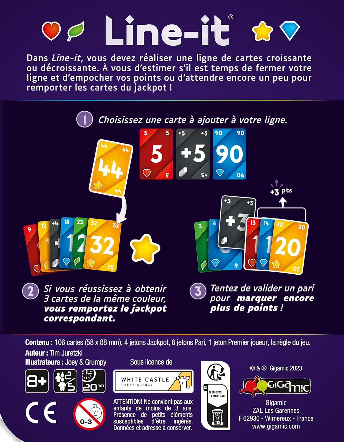 Dans Line-it, vous devez réaliser une ligne croissante ou décroissante. A vous d’estimer s’il est temps de fermer votre ligne et d’empocher vos points ou d’attendre encore un peu pour remporter les cartes du jackpot.