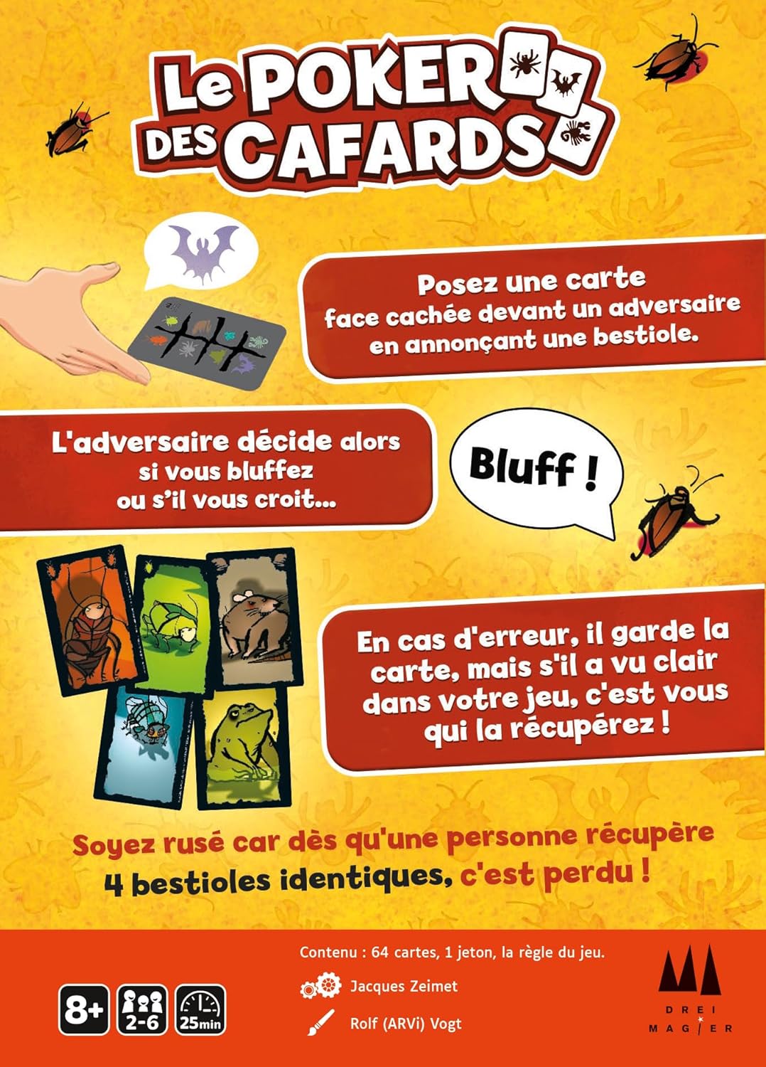 Les cartes représentent différentes sortes de bestioles très sympathiques (chauve-souris, cafard, crapaud, scorpion…). Un des joueur pose une carte devant lui face cachée et annonce un animal à un joueur qui va alors devoir décider s’il pense que le joueur ment ou non. Si ce dernier tombe juste, le joueur qui a présenté la carte la reprend et la dépose face visible devant lui. S’il se trompe, c’est lui qui la prend devant lui. Le premier à se retrouver avec 4 animaux de la même espèce a perdu. Vous pouvez aussi décider de repasser la carte à un autre joueur !