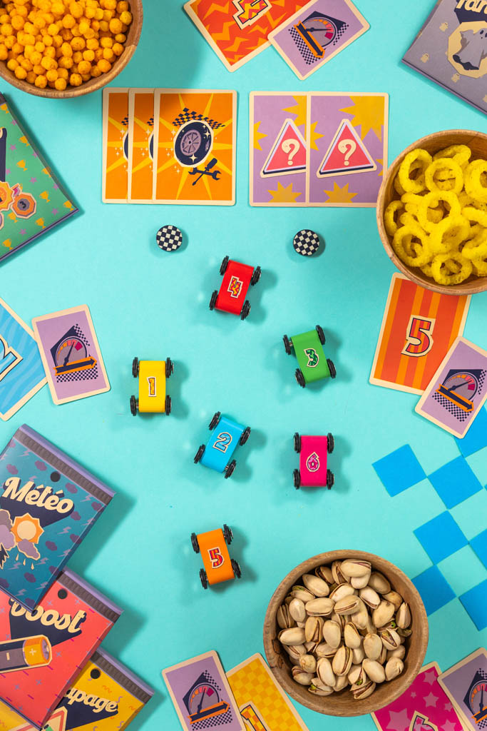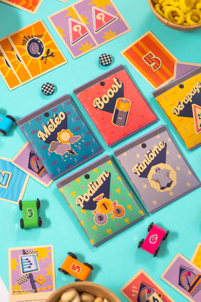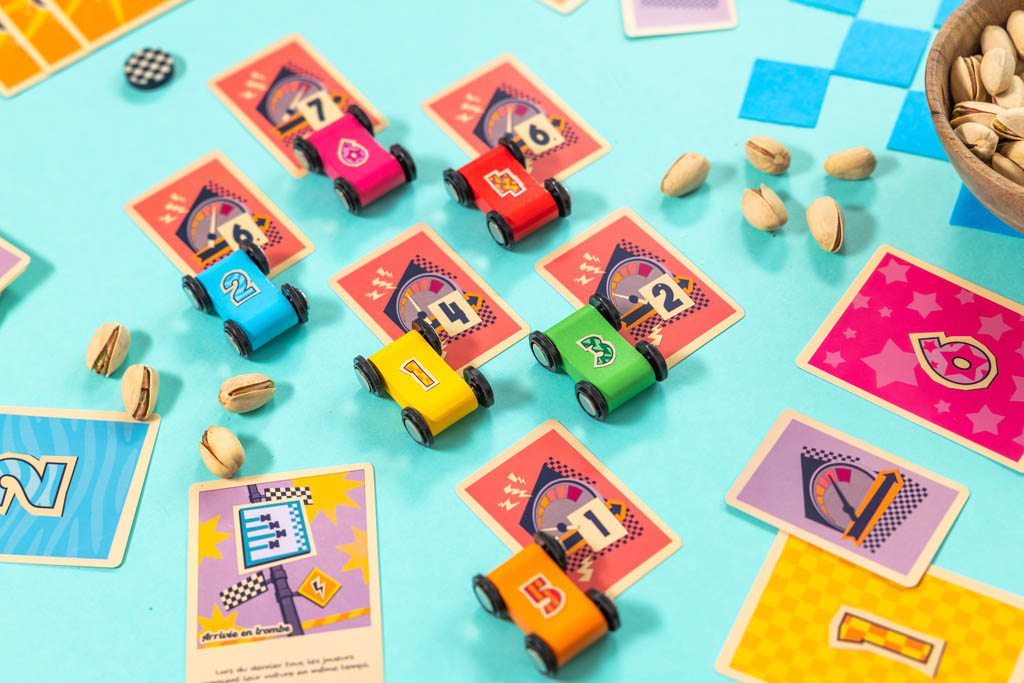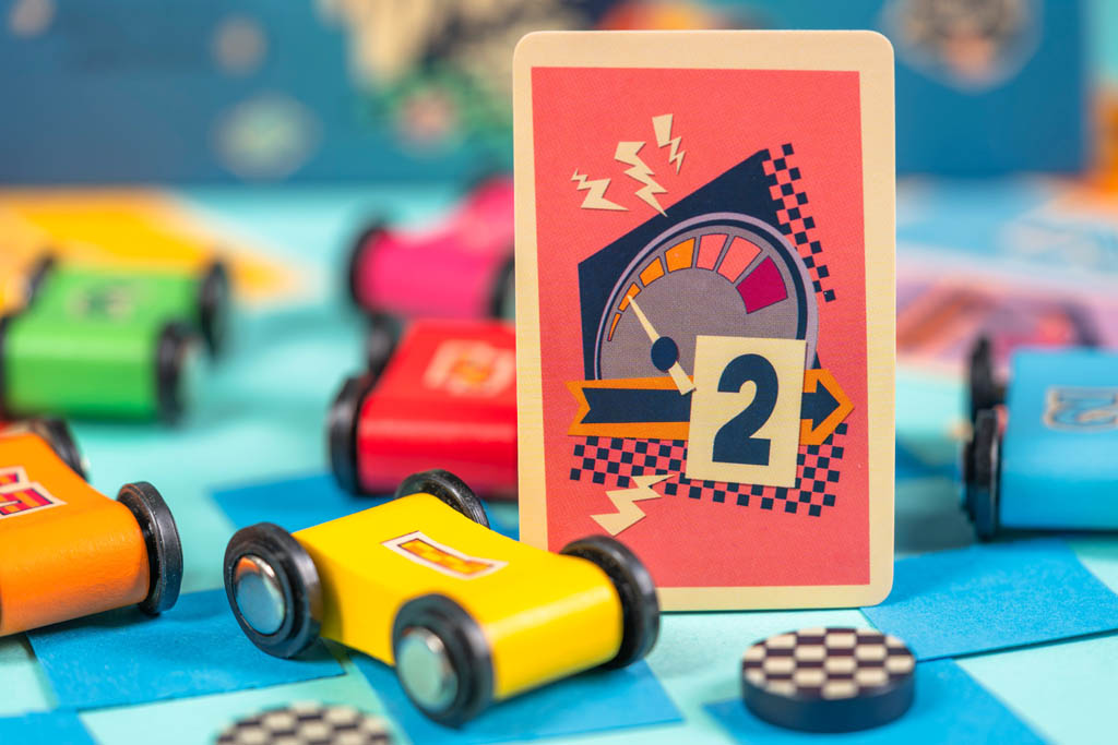 Piochez une carte Vitesse et déplacez votre voiture sur le circuit que vous venez de créer. De 1 à 7, ces cartes ne vous feront pas avancer de la même manière et c’est à vous d’estimer la distance que votre voiture doit parcourir.