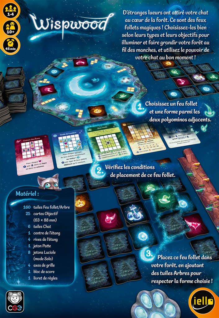 Bienvenue à Wispwood, un lieu magique peuplé de feux follets lumineux. À votre tour, choisissez une tuile de feu follet et une forme à placer dans votre grille personnelle, votre propre forêt en pleine croissance. Chaque feu follet a des envies quant à l’endroit où il souhaite briller, et même les arbres magiques ont leurs préférences ! Vous devrez répondre à leurs attentes au cours de trois manches de score. Entre les manches, la forêt change, s’estompant et s’étendant, mais les feux follets que vous avez déjà placés restent en place, façonnant les possibilités à venir.
