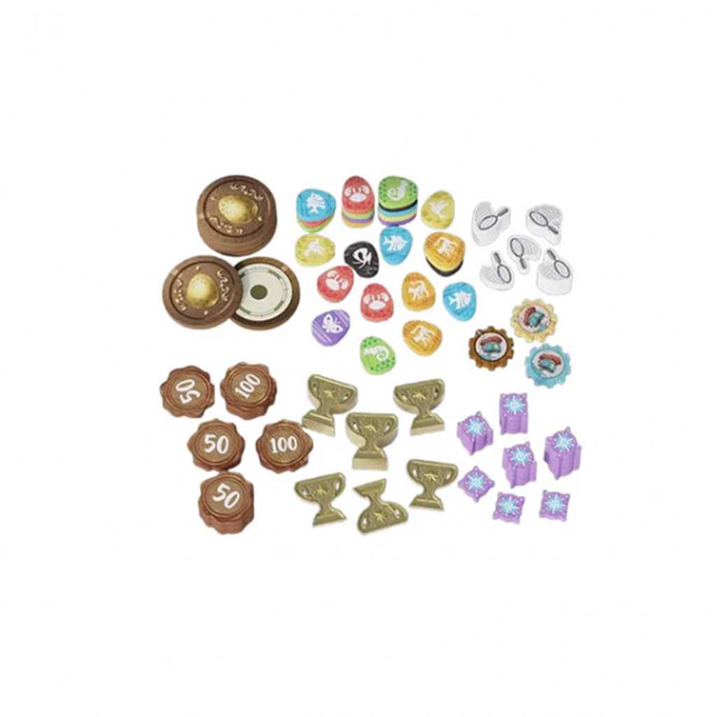 Un kit qui remplace les oeufs, les jetons énergie, les filets à papillon, les jetons de score 50/100, les jetons solo, les jetons de pose d’oeufs par des jetons en bois et les trophées par des éléments en métal !