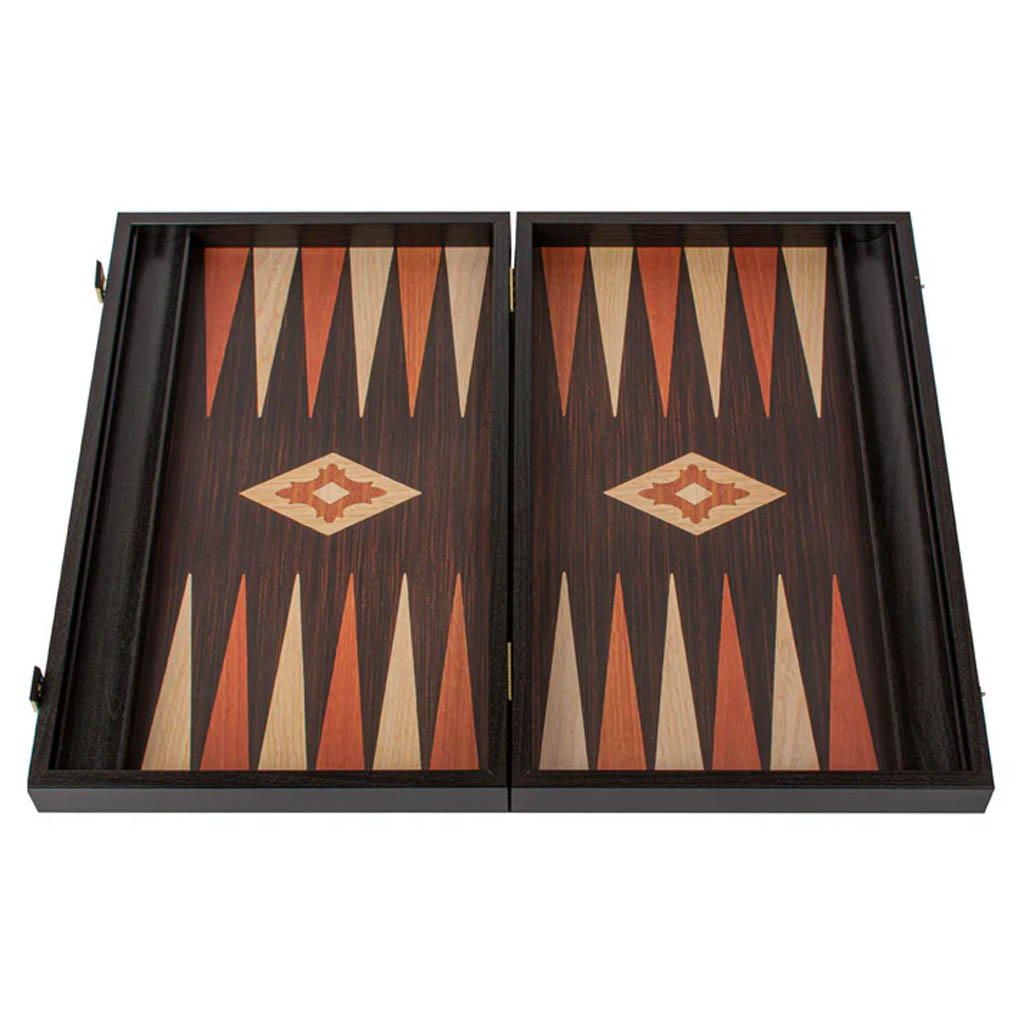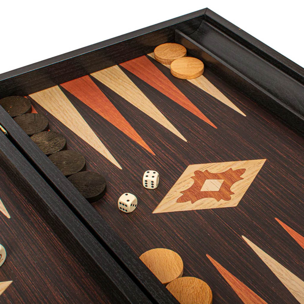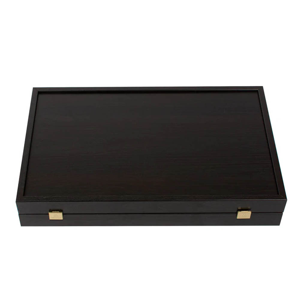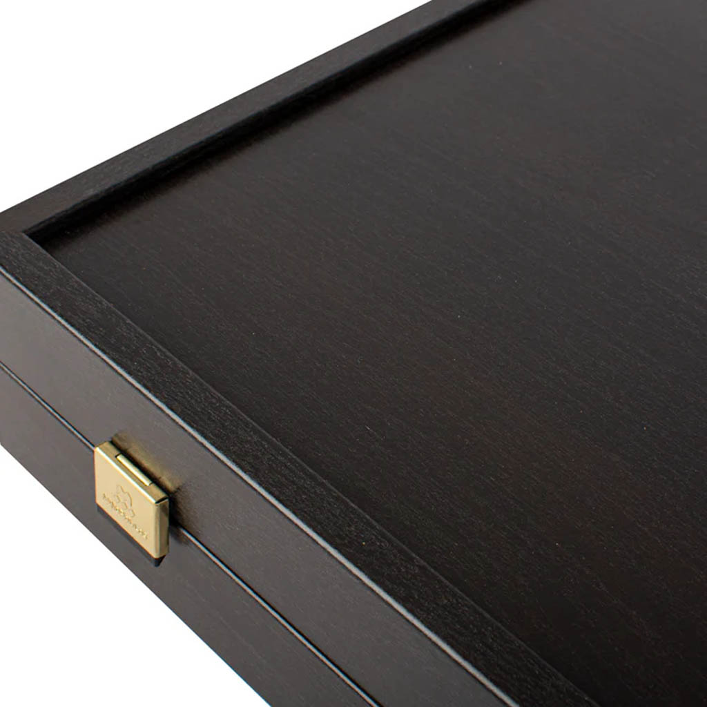 Le plateau de backgammon coloris wengé présente une surface de jeu imprimée (et non incrustée) mettant en valeur un élégant motif central en forme de losange. Les flèches contrastées acajou et chêne apportent un rendu visuel remarquable, tout en améliorant l’esthétique et la jouabilité du plateau. Les compartiments latéraux permettent un rangement pratique et organisé des pions, renforçant la fonctionnalité de l’ensemble.
