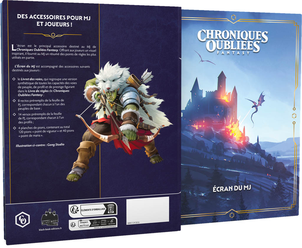 L’écran est le principal accessoire destiné au MJ de Chroniques Oubliées Fantasy. Offrant aux joueurs un visuel inspirant, il fournit au MJ un résumé des points de règles les plus utilisés en partie.